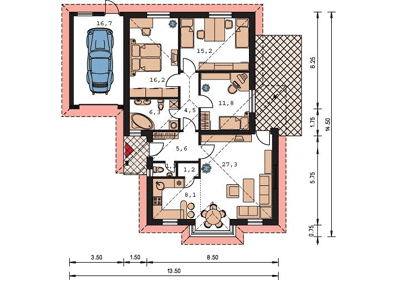 Plan casa. Nivelul cuprinde: 3 dormitoare, living, bucatarie, dining, baie , hol si garaj. TRANSVAL
