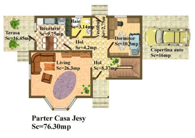 Plan parter. Nivelul cuprinde: dormitor, bucatarie, baie, living, hol. NEO CONSTRUCT