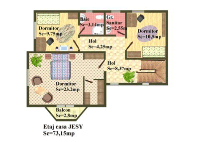 Plan mansarda. Nivelul cuprinde: 3 dormitoare, 2 bai, hol. NEO CONSTRUCT