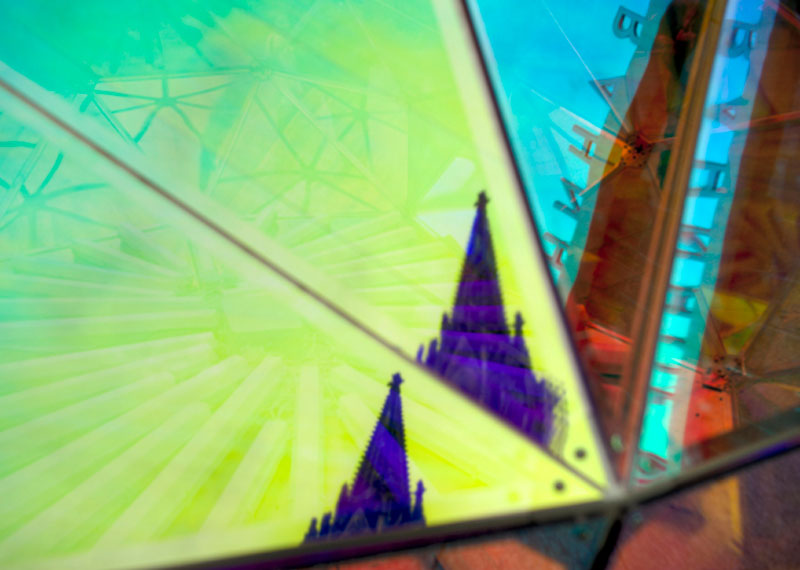 In timp ce sculptura este inconjurata de catre privitor, imaginile reflectate pe un invelis impartit in suprafete triunghiulare, sunt in continua schimbare. In acest fel, spectatorul devine parte integranta a instalatiei si reflexiilor sale complexe.