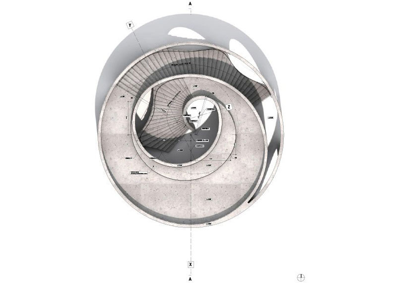 Forma sa rotunda a fost realizata anticipand la nivel formal miscarea oamenilor de-a lungul platformei, urcand pentru a admira minunata priveliste asupra provinciei din jur. Deschiderile boltite asimetrice asigura accesul catre o sala deschisa acoperita partial cu platforma de deasupra.