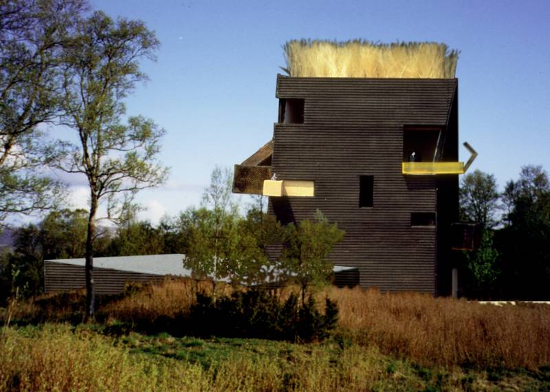 Conceptul cladirii este cel de creare a unei “cladiri invelis”, a unui camp de batalie intre forte invizibile. Invelisul exterior din lemn negru, tratat cu smoala este caracteristic bisericilor traditionale din lemn norvegiene.