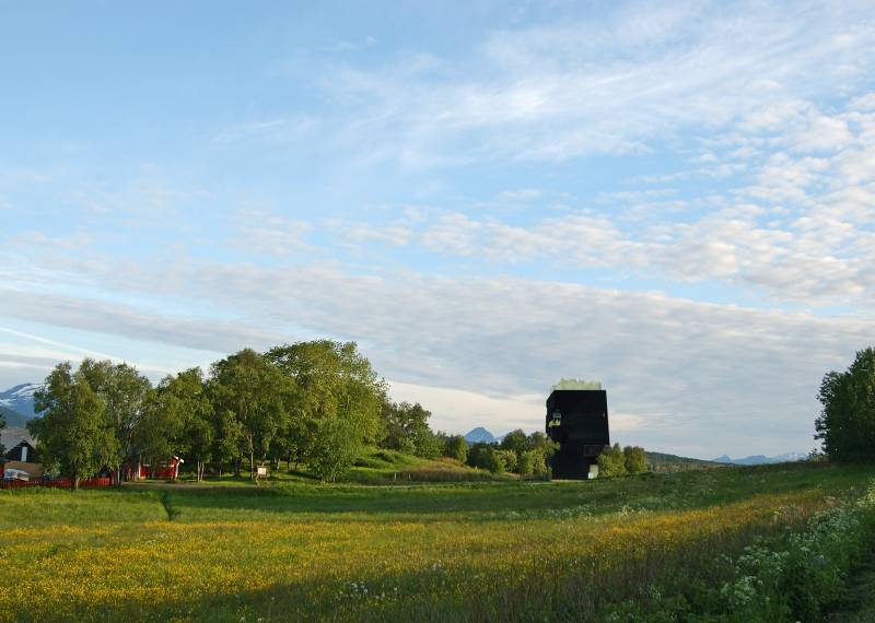 Acoperisul prevazut cu o gradina de iarba lunga reinterpreteaza acoperisurile de paie traditionale norvegiene.