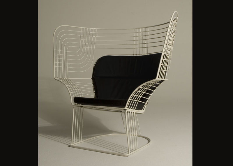 Acest scaun usor este produs din fier forjat, finisat cu pulbere alba. Scaunul este pus in valoare de tapiteria confectionata din piele neagra.
