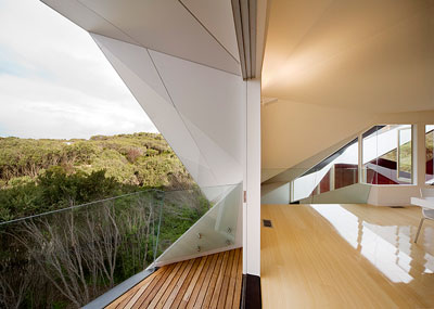Forma sa interminabila de cochilie rasucita ofera o intimitate aparte. Expresivitatea caracterului de origami este redata prin utilizarea fatadelor colorate. Nuantele subtile folosite accentueaza fatadele si, implicit, si aspectul origami al casei. Perimetrul negru al casei este domol si important, peretii negri punand in lumina imprejurimile naturale. Negrul din interior formeaza un efect de incadrare a panoramei.