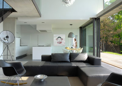In living-room, ferestre imense se deschid catre gradina, pentru ca beneficiarul sa aiba senzatia ca aceasta din urma este o componenta a casei. Astfel, se creeaza senzatia unei continuitati intre interior si exterior. Semineul, greoi si, in acelasi timp, usor, functioneaza ca un paravan intre living si camera dedicata muzicii. Acesta este realizat din otel si este partial umplut cu beton refractar, asigurand confortul termic.