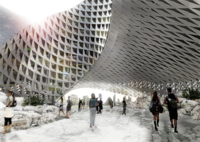 Fatada care invaluie intreaga structura este conceputa ca o banda Möbius dubla, mergand dinspre vertical spre orizontal si invers. Invelisul complex este, de fapt, o suprafata riglata, structurata intr-un mod foarte simplu si repetitiva, utilizand sectiuni drepte si zabrele.