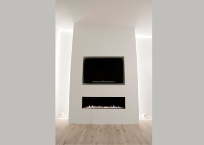 Piesa centrala din living este peretele care este usor deplasat fata de structura exterioara, continand un semineu si un ecran plat. De la living spre bucataria micuta s-a folosit o usa glisanta pentru a economisi cat mai mult spatiu posibil. Corpurile din bucatarie sunt prevazute cu lumini, pentru a asigura o munca mai buna. Unul dintre principiile dupa care arhitectii au amenajat apartamentul a fost acela de a compune cat mai multe axe posibile, astfel incat ochiul sa poata percepe intreaga lungime a obiectului arhitectural.