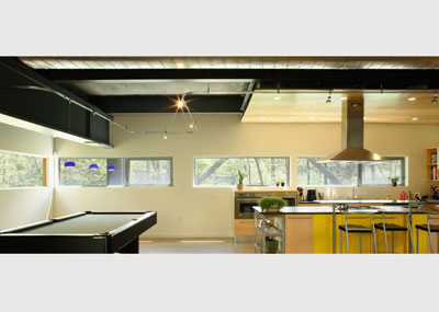 Arhitectii au optat pentru scari fara contratreapta, pentru a reda senzatia de plutire, insa se apeleaza si in acest caz la lemn, pentru a mai diminua aspectul rece conferit de ciment si structura metalica. In zona bucatariei, ferestrele-banda inglobeaza peisajul inconjurator si, totodata, fac referire la arhitectura moderna, care se baza pe functionalitate.