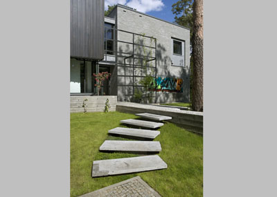 Drumul pavat, peste care pasim in timp ce ne indreptam spre intrarea acestei case, penetreaza interioarele si iese prin celalalt capat al casei, unde se ascunde gradina, arhitectii comparandu-l cu un covor de piatra aruncat pe pamant.