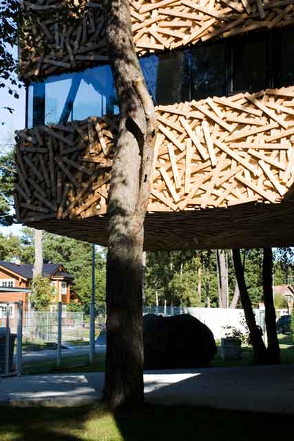 Casa pe care v-o prezentam in editia de astazi este una neconventionala, atipica zonei in care este situata. Cei de la Muru&Pere, o companie de arhitectura mica, au dorit sa integreze cladirea in mediul inconjurator, realizand o legatura intre interior si exterior. Totodata, invelisul exterior din lemn ce aminteste de un cuib de pasare izoleaza, in acelasi timp, camerele de privirile din exterior, creand efectul unei oglinzi.