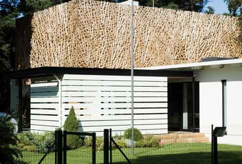 Casa pe care v-o prezentam in editia de astazi este una neconventionala, atipica zonei in care este situata. Cei de la Muru&Pere, o companie de arhitectura mica, au dorit sa integreze cladirea in mediul inconjurator, realizand o legatura intre interior si exterior. Totodata, invelisul exterior din lemn ce aminteste de un cuib de pasare izoleaza, in acelasi timp, camerele de privirile din exterior, creand efectul unei oglinzi.