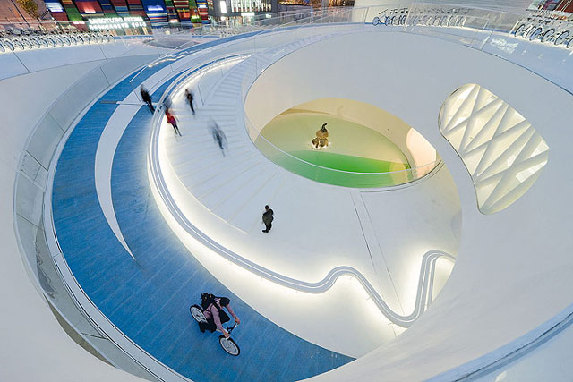 Pavilionul este conceput ca o bucla de trafic creata de miscarea bicicletelor si a pietonilor prinsi in aglomeratie. Peste 300 de biciclete gratuite situate pe acoperisul verde ofera vizitatorilor sansa de a experimenta stilul de viata urban danez, care pune mare accent pe deplasarea cu ajutorul bicicletelor. Buclele sunt conectate in doua locuri. Venind din interior, vizitatorii se pot duce pe acoperis, pot alege o bicicleta si revizita expozitia cu aceasta asa cum aleea exterioara aluneca in interior si strabate intreaga expozitie. Succesiunea de evenimente din cadrul expozitiei are loc intre doua fatade paralele - interna si externa. Cea interna este inchisa si contine diferite functii ale pavilionului. Latimea variaza si este definita de programul spatiului interior. Fatada externa a pavilionului este realizata din otel perforat. In timpul serii, fatada devine un instrument de lumina interactiva, luminand trecatorii.