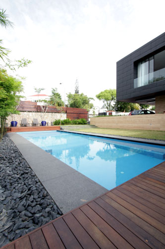 Clientul a cerut folosirea intr-un procent cat mai mare a vegetatiei, prin urmare, o mare parte a peisajului a fost lasata in forma sa naturala, exceptie facand zona perimetrala a piscinei, care a fost acoperita cu deck-uri din lemn.