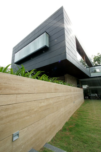 In ceea ce priveste acest proiect, detaliul care atrage atentia cel mai mult este finisajul metalic de culoare gri inchis, folosit in mod generos pe fatada exterioara, caruia i s-au conferit accente moderne, liniare. Pentru a completa acest aspect aspru, colturos, s-au folosit in interiorul casei mai multe materiale naturale, precum grinzi sau lambriu din lemn de tek.