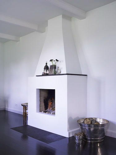 Casa era prevazuta cu patru sobe, insa nu avea niciun semineu deschis, motiv pentru care noii proprietari au ales ca un zidar local sa le realizeze unul in camera de zi. Placile cu care acesta este finisat sunt pietre de lava din Italia si au aceeasi culoare cu cea a pardoselii. Galeata mare, argintie este perfecta pentru depozitarea lemnelor, fiind, totodata, un accesoriu chic.