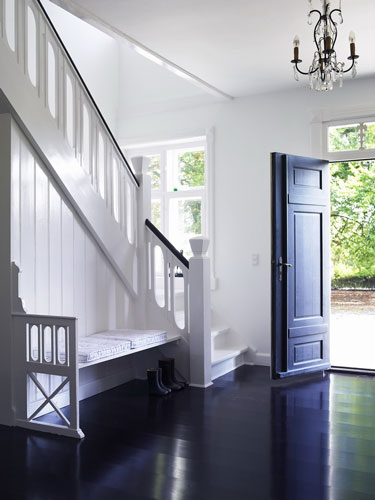In ceea ce priveste pardoseala, s-a optat pentru un finisaj din lemn vopsit si lacuit. Podeaua inchisa la culoare are rolul de a contrasta si de a pune, in acelasi timp, in valoare peretii si mobilierul alb.