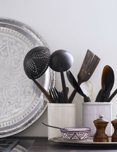 Intrucat bucataria are o importanta deosebita in viata fiecaruia dintre noi, designerul danez nu a neglijat aceasta incapere, mobilata cu piese din lemn de mango, pe care a accesorizat-o cu obiecte unice, pentru a obtine un decor cat mai personal.
