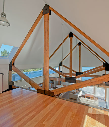 Peretele-cortina din sticla transparenta permite peisajului sa se contopeasca cu locuinta. Structura grea, din lemn, a pavilionului locuibil are rolul de a indica functia sa sociala. Strategia solara a cladirii pasive este extinsa si in interior, prin utilizarea unui sistem de incalzire hidraulic, prin pardoseala.
