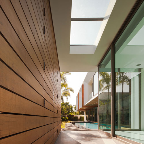 Intrucat volumele sunt impartite, se creeaza un spatiu semi-exterior, la limita dintre interior si exterior. Materialele naturale foarte variate, precum apa, lemn sau iarba sunt introduse in fiecare spatiu obtinut. La realizarea acestei case au fost folositi pereti din caramida, tencuiti si sticla colorata. In zonele in care volumele au fost divizate, s-a utilizat ca finisaj lemnul.
