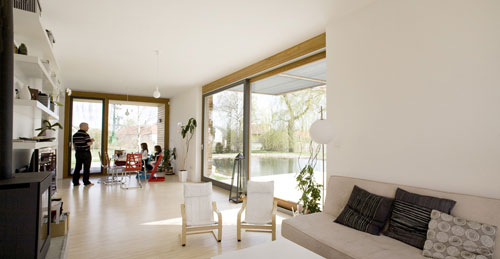 Elementele suplimentare, realizate in culori inchise - tamplaria ferestrelor si volumul aferent camerei de serviciu, aflate in zona de nord - sunt realizate din placaj de plop. Structura acoperisului se sprijina pe grinzi cu zabrele, realizate din profile din lemn de molid, acoperite cu panouri de OSB si foi metalice izolate.
