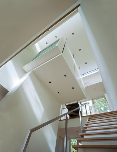 Camera de meditatie, in jurul careia este construita intreaga casa, este inconjurata de un container din lemn, care imbraca zonele de locuit din casa. Aceasta anvelopanta este, la randul sau, adapostita de ziduri din stuc, ce servesc ca strat protector si ca legatura intre casa si pamant. Spatiile dintre volumele stivuite sunt taiate strategic, pentru a permite patrunderea luminii in interior.