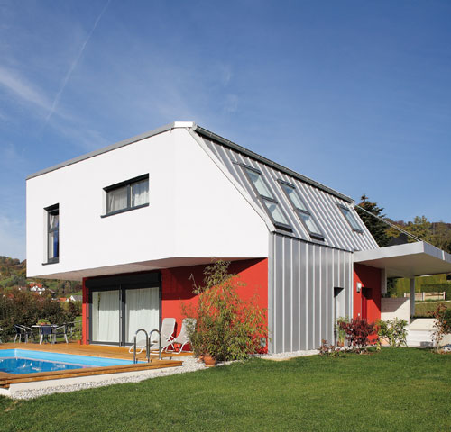 Casa unifamiliala, Graz, AustriaOpinia arhitectului: "Conceptul acestei case corespunde naturii celor care o locuiesc - concentrata in jurul centrului, marcata de elemente viu colorate si iesite din comun: deasupra planului patrat de la sol, partea sudica si cea vestica ies proeminent din cadrul clasic, la fel si fatada estica. Constructorul a fost cel care m-a convinsa sa construiesc cu Ytong. Rosul inchis folosit la fatada admitea doar o solutie de constructie monolitica, din cauza provocarilor ce tin de variatiile de temperatura".