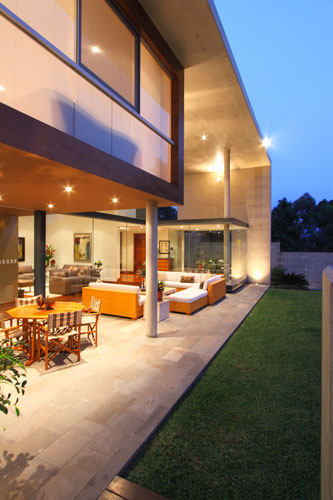 Casa consta in trei niveluri, ce urmaresc configuratia ascendenta si stancoasa a terenului. Distributia functionala si spatiala au derivat din necesitatile clientilor. Gradina principala, piscina si zona de zi se afla la primul nivel, in timp ce zonele private sunt amplasate la urmatoarele doua niveluri.