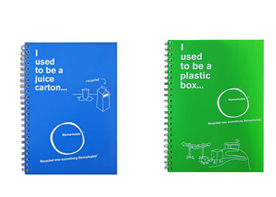 Pe fiecare produs Remarkable veti gasi informatii despre produsul/ produsele din care a fost reciclat. Astfel, penarele sunt realizate din cauciucuri vechi, creioanele din pahare de plastic, carnetelele din cutii de suc etc.