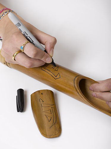 Taiati si finisati partea inferioara a bucatilor de bambus asa cum este ilustrat in imagine. Apoi desenati cu pixul modelele dorite pe fiecare bucata de bambus si marcati cu linii conturul fiecarui cerc de lemn.
