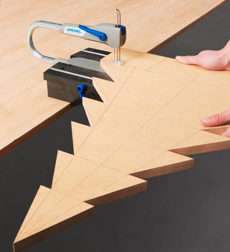 Acum , dupa ce ati desenat copacul de Craciun pe panoul MDF, taiati forma copacului prin folosirea Dremel Moto-Saw si a lamei pentru taierea fina in lemn MS52. Aceasta parte va deveni partea din fata a calendarului de Craciun.
