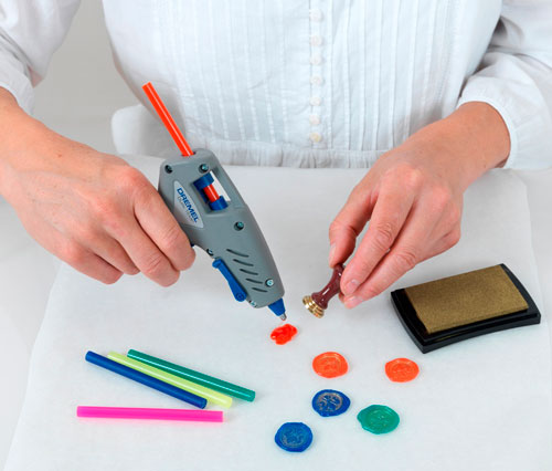 Pentru a realiza sigiliile decorative, introduceti o bagheta de lipit colorata in pistolul de lipit 930. Puneti o cantitate mai mare de lipici pe pergament si, cu miscari rapide, inainte de a se usca lipiciul, apasati stampila pe tusiera si apoi pe lipiciul cald. Repetati pentru a face mai multe sigilii. Dupa ce s-au racit, eliminati pergamentul de pe spatele sigiliilor.