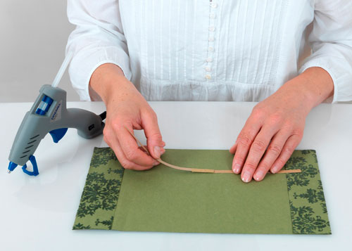 Taiati hartie decorativa de 43 x 18 cm. Asezati-o cu fata in jos si trasati linii la 10 cm de fiecare capat scurt, apoi pliati de-a lungul liniilor si lipiti partile pliate cu ajutorul pistolului de lipit Dremel 930 si a baghetelor de lipit; astfel colturile cadoului-surpriza vor fi intarite. Utilizati o cantitate mica de lipici pentru a lipi pocnitoarea de partile care acopera cadoul-surpriza.