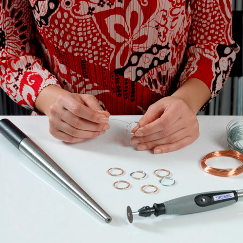 Taiati o bucata de sarma si rasuciti-o de trei ori in jurul unei mandrine pentru bijuterii pentru a crea cercuri bine definite. Apoi mai faceti inca sase cercuri. Taiati alte bucati de fir de cupru si rasuciti-le uniform si ferm in jurul cercurilor.