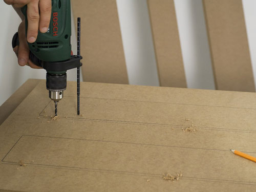 Trasati cu creionul cate o linie, atat pe partea posterioara a panoului frontal cat si pe partea anterioara a panoului posterior, la 8 mm sub deschiderile decupate. Repartizati acum pe fiecare dintre aceste patru linii, conform distantelor specificate pe schita noastra, cate cinci gauri, adanci de 10 mm, in care veti fixa ulterior suporturile de margine pentru tabliile de fund din sticla acrilica. Diametrul gaurilor depinde de suporturile de margine utilizate. Atentie: nu gauriti pana dedesubt! Cel mai bine folositi un limitator de reglare a adancimii.