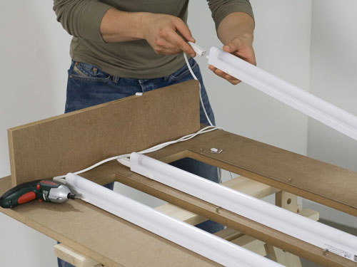 Aveti grija ca toate cablurile sa fie orientate in aceeasi directie. Astfel, mai tarziu le veti putea trece prin deschiderea dintre tablia de fund din sticla acrilica si latura panoului frontal si cobori jos, pentru a le racorda la o priza tripla. Pe aceasta din urma o veti monta in continuare, pe partea posterioara a panoului frontal. Va mai trebuie doar un cablu pentru a alimenta cu energie aplica de perete.