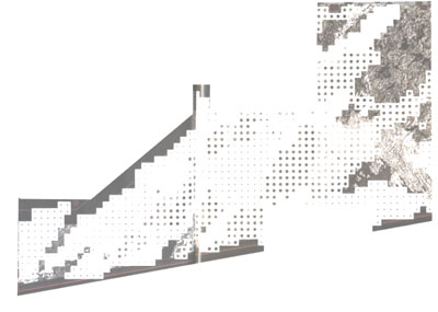 Aceasta poza nu este transcrisa intocmai ci realizata printr-un procedeu informatic pentru a obtine o imagine abstracta, pixelata. Un ansamblu de puncte care va continua trama gradinii. Dale perforate de plante si copaci, forma a naturii reiesind din artificiul informatic, acolo unde Nagouchi a utilizat artificiul plastic.