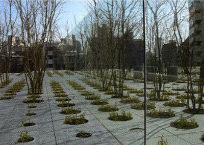 Pentru ca acoperisul sa ramana o terasa, aceasta natura transpozata este prezentata ca fiind fixata sub sol, iesind prin dale de granit. Aceste perforatii filtreaza in anumite feluri natura, care, in suprafata, compune un veritabil peisaj : iarba(bambus pitic), copaci si apa iesind din mai multe goluri.