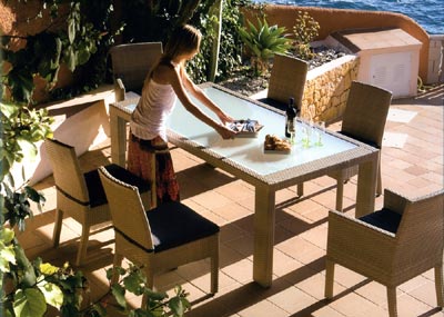Masa dreptunghiulara Nemo realizata din fibre sintetice cu aspect de ratan ce ii confera rezistenta la actiunea factorilor atmosferici, sticla inclusa, dim. 200Lx100Ax75H cm. Scaune Nemo realizate din fibre sintetice cu aspect de ratan ce le confera rezistenta la actiunea factorilor atmosferici, dim. scaun cu brate 48Lx63Ax89H cm dim. scaun fara brate 48Lx63Ax89H cm.