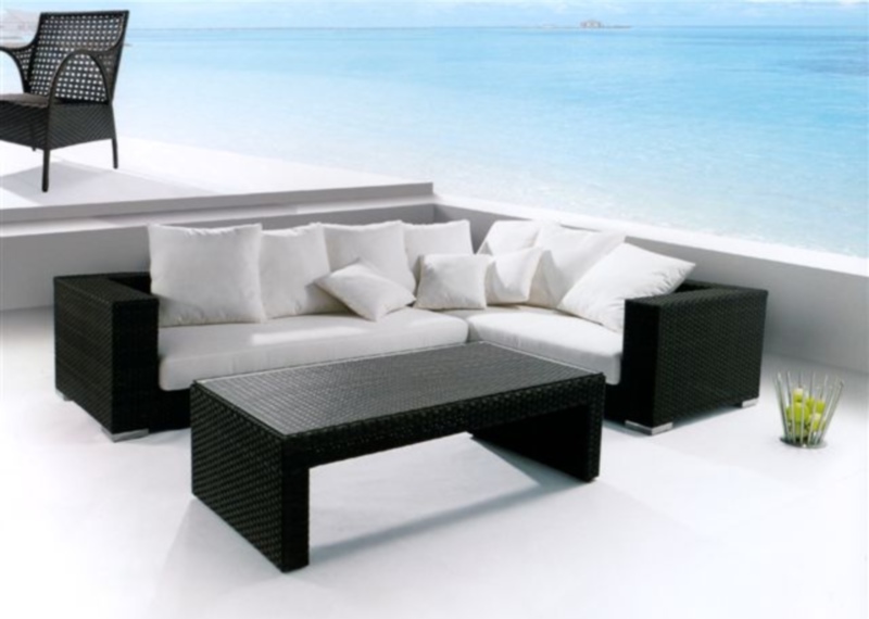 Set canapea colt si masuta LOUNGE realizat din fibre sintetice cu aspect de ratan ce ii confera rezistenta la conditiile atmosferice.