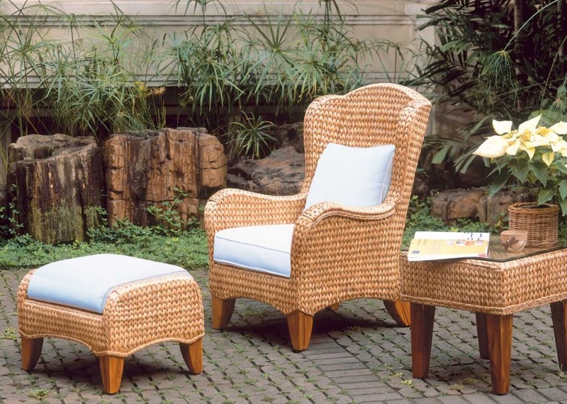 Set terasa format din fotoliu, reazem picioare si masa. Fabricate din schelet de lemn masiv de esenta tare si impletitura de zambila de apa.