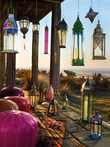 Pentru a-ti transforma gradina intr-un loc feeric, lumina joaca un rol important. Ca sa obtii o lumina ambientala, achizitioneaza niste lumanari. Ca suporturi, foloseste unele sub forma de felinare, pe care le poti agata sau le poti amplasa direct pe sol. Utilizeaza mai multe felinare, in culori si de dimensiuni diferite. Atmosfera rezultata va face trimitere la ineditele amenajari marocane, pline de culoare, care constituie o adevarata oaza de relaxare. Daca nu gasesti astfel de produse sau bugetul nu iti permite sa le achizitionezi, le poti inlocui cu niste borcane colorate, pe care le vei lega cu ajutorul unei sarme. Pentru a completa aceasta ambienta de reverie, decoreaza terasa cu margele si perne in culori aprinse.Foto: HomeSense
