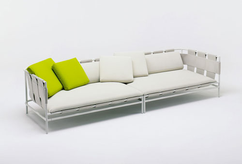 Canvas - Design: Francesco Rota. Structura canapelei, realizata din otel tratat cu cataforeza si poliester lacuit in in culorile avorio sau grafit, este complet vizinila si acoperita cu benzi elastice din materiale Paola Lenti numite Rope sau Aquatech. Pernele pentru sezut si spatar pot fi comandate fie in finisaj pt interior, fie pentru exterior, rezistente la umezeala. Se pot comanda separat si alte perne pentru cap sau sezut.