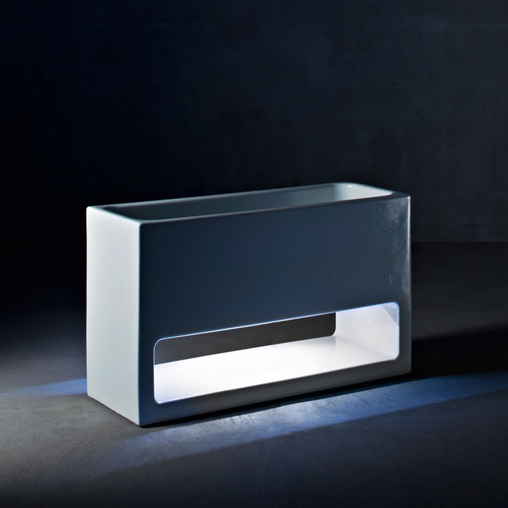 Ghiveci Lluna - Design Joan Gaspar. Dimensiuni: 110 x 40 x 65 cm. Dotat cu unitate de lumina cu LED-uri cu sistem eficient de energie; cablu electric neopren, 3m lungime; priza cu sistem anti-stropi. Echipat cu sistem de drenare a apei. Pret: Finisaj standard: 660 euro + TVA. Finisaj lacuit: 1.170 euro + TVA