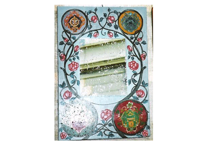 Oglinda pictata manual, tempera cu emulsie de ou pe lemn, motive medievale- in cele patru colturi apar motive heraldice: blazoane a patru bresla medievale - bresla funarilor, bresla armurierilor, bresla putinarilor si bresla covrigarilor. Dimensiuni: 33/48 cm. Pret: 100 EURO www.ornamentica.ro