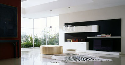 Mobilier pentru living compus din comoda joasa, comoda cu sertare, polita suspendata si dulapuri suspendate, realizate din MDF lacuit. Dimensiuni: l 360 h 197.6 p 35.5/45.1/65 Colectia: La Mia Casa Prêt: 5500 EURO + TVA / comp. Produs in Italia. In exclusivitate in Romania prin INTERIOR STORE