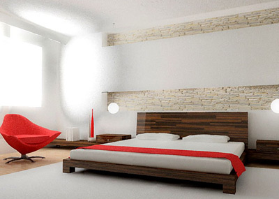 Elegenta stilului minimalist reuseste sa creeze in dormitorul matrimonial o imagine spectaculoasa. Formele simple, culorile odihnitoare si finisajele naturale constituie un tot unitar de bun gust si armonie. Pentru aceasta zona s-a ales un covor fin, alb. Atmosfera prinde viata datorita fotoliului rosu, amplasat si ales inspirat.