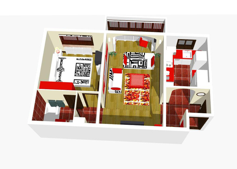 Apartamentul cuprinde urmatoarele incinte: living, dormitor, bucatarie, baie si hol. In urma modificarilor facute a rezultat o locuinta spatioasa, aerisita si primitoare. La imaginea de ansamblu contribuie si piesele de mobilier, accesoriile si obiectele decorative.