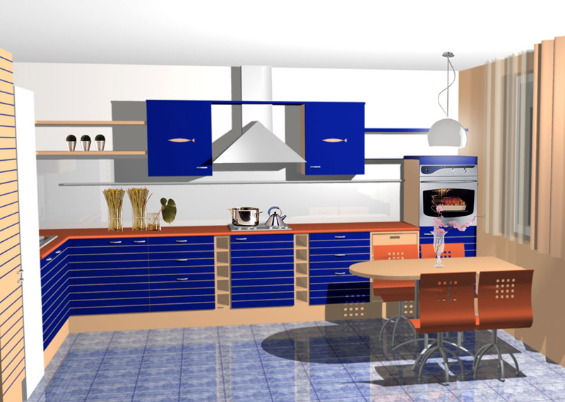 varianta 4 Desi aceasta bucatarie se afla intr-un apartament de bloc, dimensiunile destul de generoase au facut posibila si amplasarea unei mese pentru 4 persoane. Mobilierul se remarca prin designul special al usilor. Pentru a constitui un tot unitar de culoare, pardoseala a fost placata cu gresie de culoare albastra.