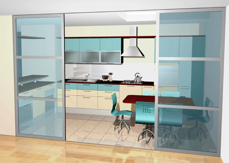 varianta 5 Culorile vesele sunt cele care atrag atentia asupra acestei bucatarii, dar tradeaza si tineretea proprietarilor, deschisi la tot ce e nou si modern. Usile glisante sunt ideale deoarece ofera spatialitate locuintei. Blatul de lucru a fost pozitionat pe doua laturi, acest lucru permitand o circulatie degajata.